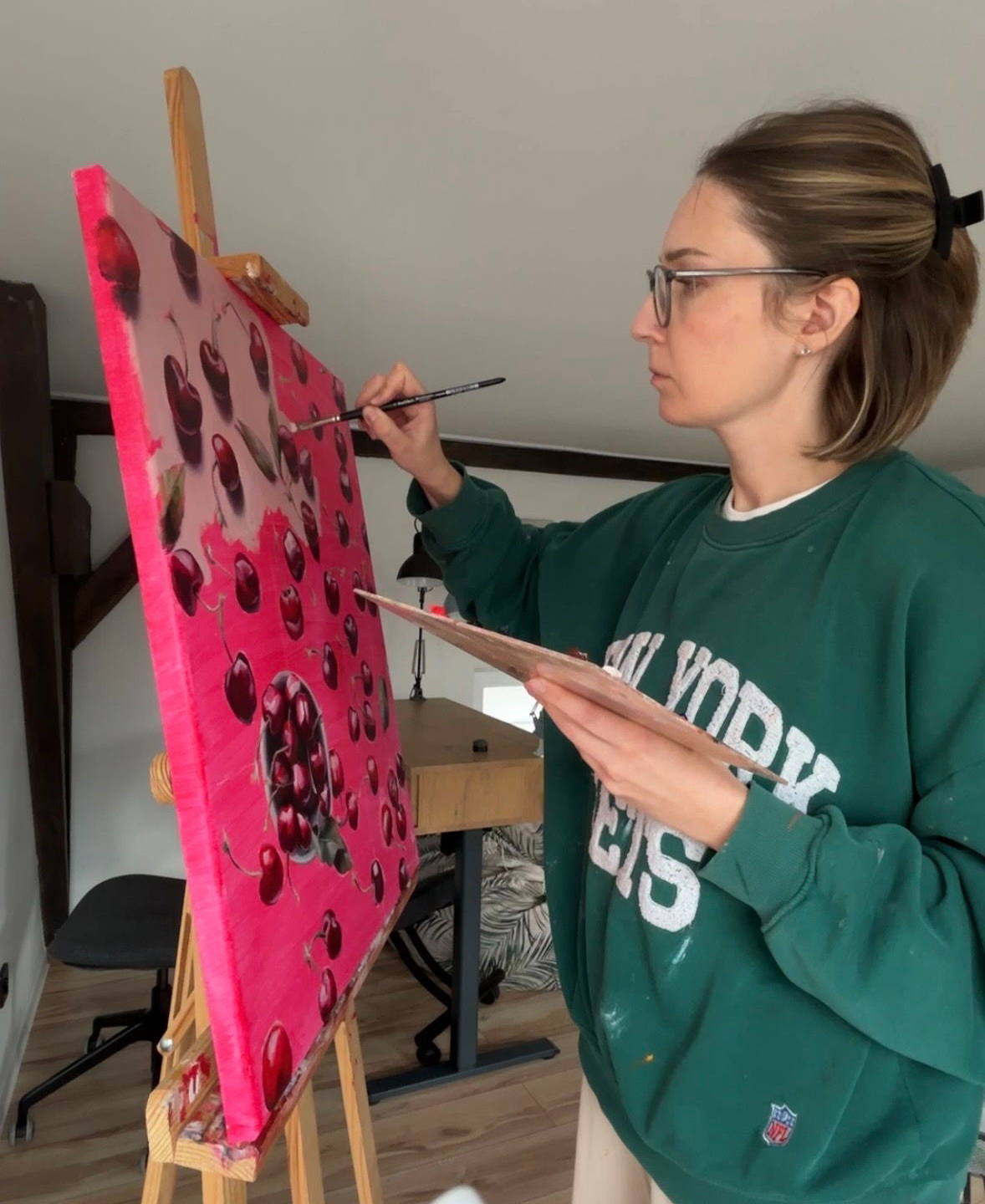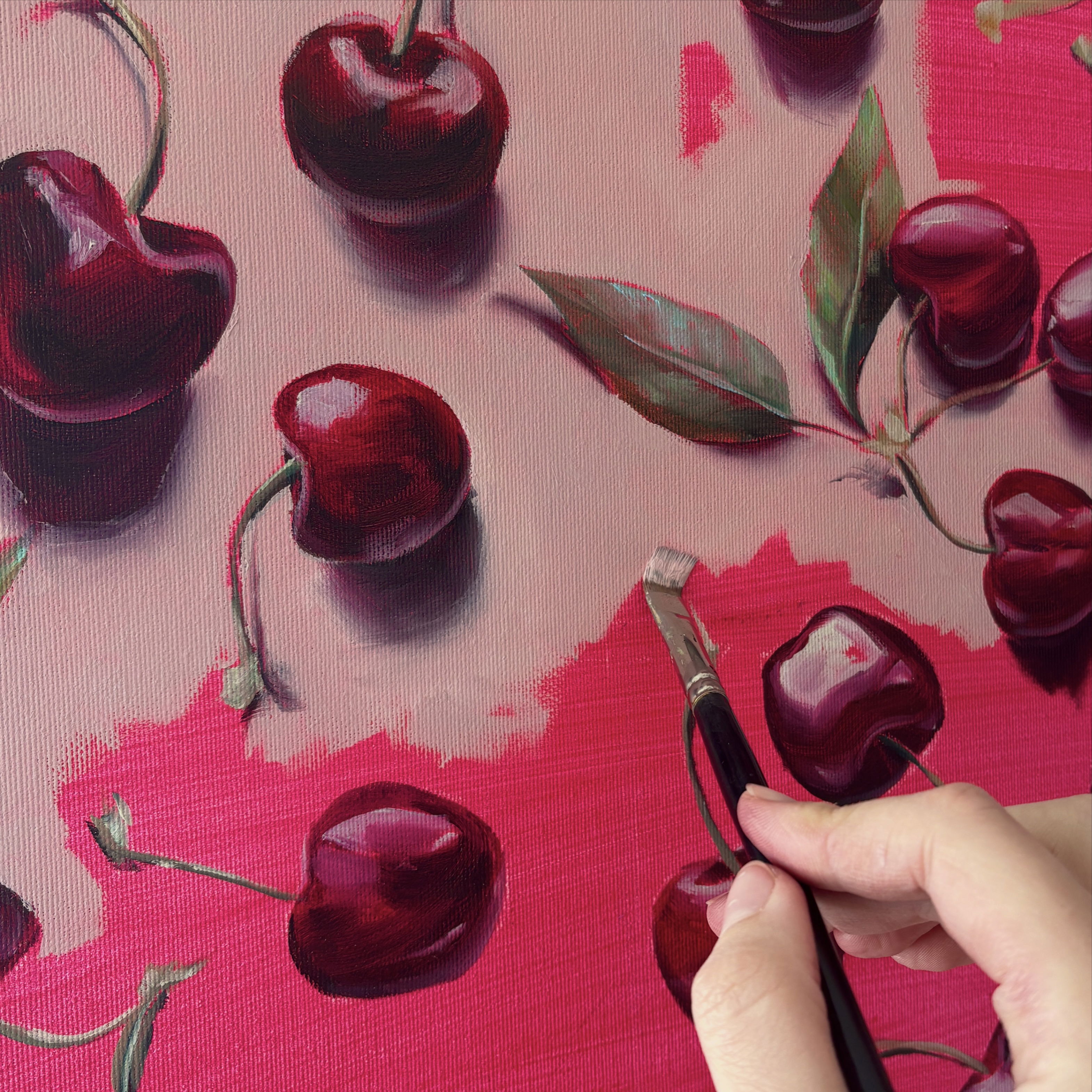 Kiedy oglądamy obraz w galerii internetowej, widzimy tylko gotowe dzieło. Dopasowane kolory, światło i kompozycję.Rzadko zastanawiamy się, ile etapów prowadzi do tego efektu. Malowanie obrazu to proces pełen decyzji: zmiany kompozycji, budowanie koloru, praca nad światłem i detalami. Dlatego postanowiłam pokazać historię jednego z moich obrazów – obrazu z wiśniami. Motyw owoców pojawia się w moich pracach często, bo daje ogromne możliwości pracy z kolorem, światłem i kontrastem.