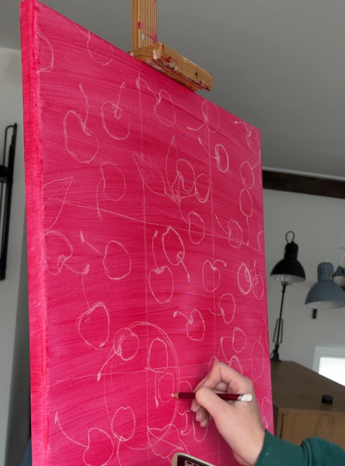 Każdy obraz zaczyna się od pomysłu.W przypadku tego obrazu inspiracją były dojrzałe wiśnie – ich głęboki kolor, błyszcząca skórka i cienkie zielone ogonki tworzą bardzo malarską kompozycję. Na początku powstaje prosty szkic, który pozwala zdecydować: