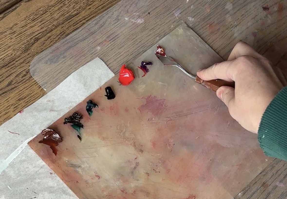 Zanim zacznie się właściwe malowanie, przygotowuję kolory na palecie.To etap, który często pozostaje niewidoczny dla odbiorcy, ale jest bardzo ważny. Odpowiedni dobór farb decyduje o tym, czy obraz będzie miał głębię i naturalne przejścia kolorystyczne. Na palecie pojawiają się różne odcienie: czerwieni, bordowych tonów, zieleni ogonków.Dopiero kiedy kolory są przygotowane, zaczyna się właściwe malowanie.