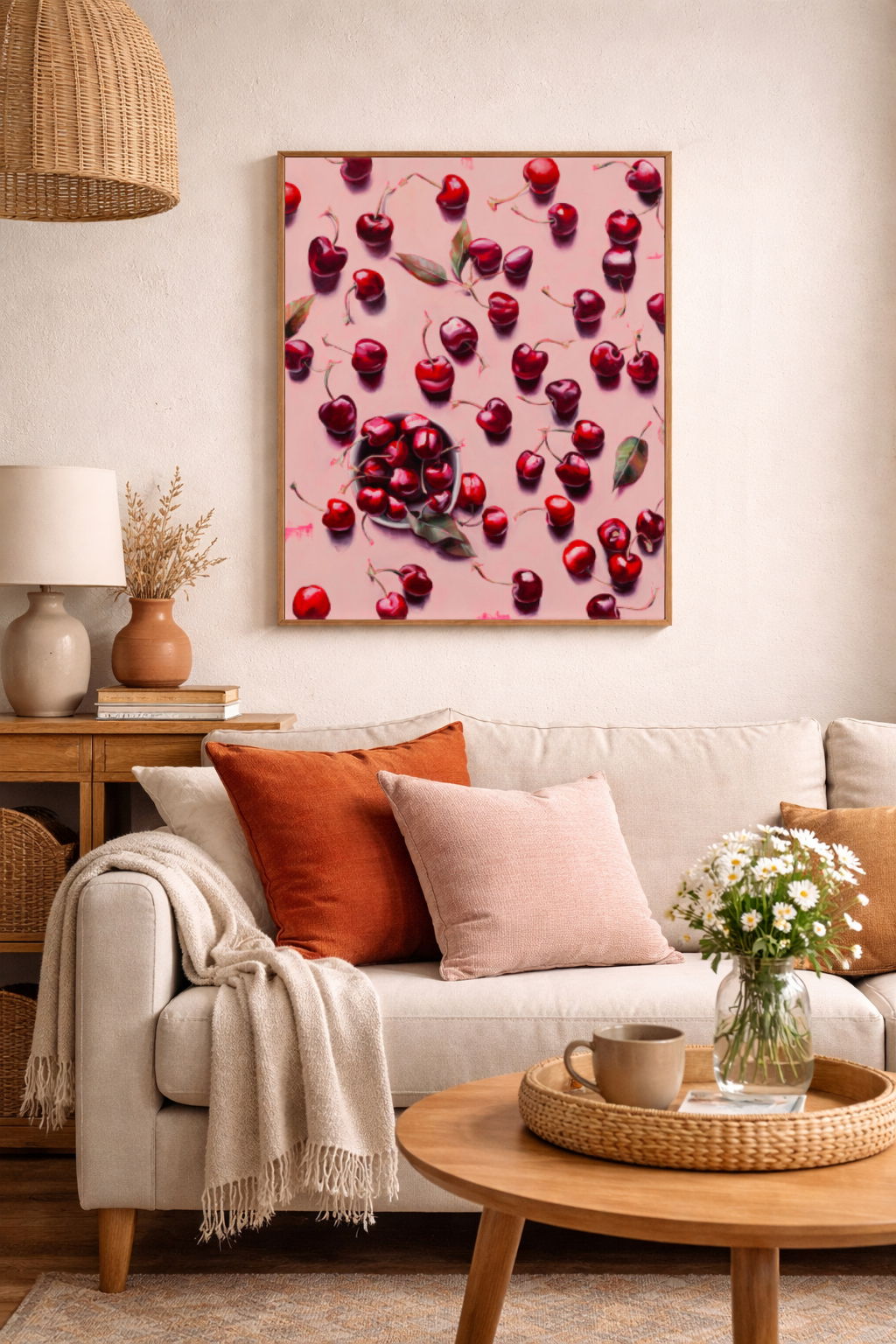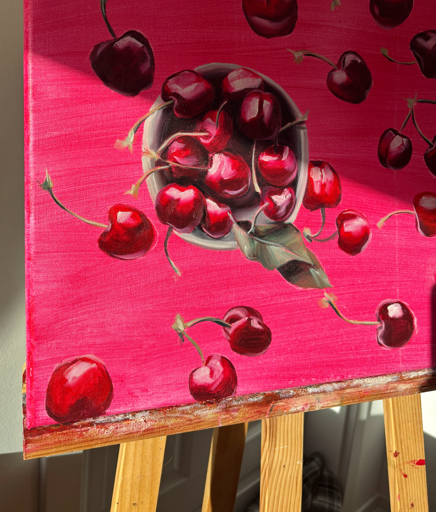 Po wielu godzinach pracy powstał obraz pełen koloru i ruchu – kompozycja wiśni rozsypanych na delikatnym tle.Ten obraz został później sprzedany na aukcji i trafił do prywatnej kolekcji. Ale dla mnie zawsze będzie również historią procesu – od pierwszego pomysłu aż po ostatni pociągnięcie pędzla.