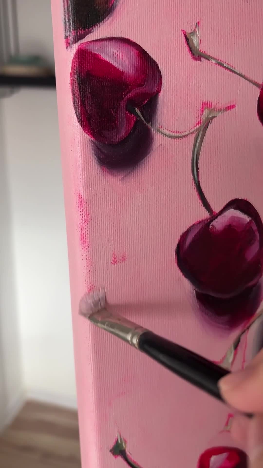 Kiedy owoce są już namalowane, zaczyna się praca nad przestrzenią wokół nich. Dodaję cienie pod owocami, które sprawiają, że kompozycja przestaje wyglądać płasko.Dopiero na tym etapie pojawia się również właściwe tło obrazu. Kolor tła ma ogromny wpływ na odbiór całej kompozycji – może podkreślić kontrast lub nadać obrazowi spokojniejszy charakter. W tym obrazie tło pozostało delikatne i podkreślające, dzięki czemu czerwone owoce jeszcze mocniej przyciągają uwagę.