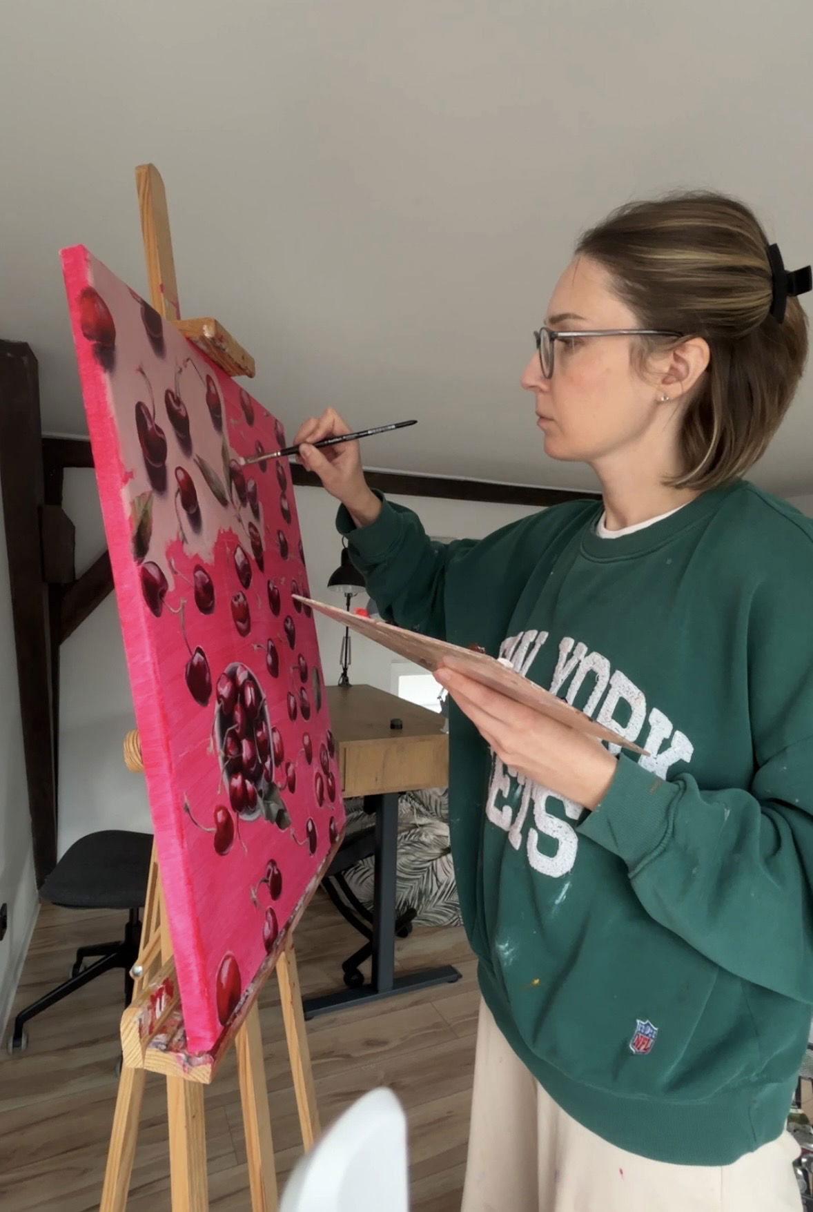 To właśnie tutaj tworzę moje obrazy olejne i akwarele, inspirowane naturą, owocami i spokojną estetyką wnętrz. Odbiór osobisty to świetna okazja, żeby zobaczyć prace w rzeczywistości, porównać kilka obrazów, sprawdzić, jak wyglądają kolory i faktura, i wybrać ten, który najlepiej pasuje do Twojego wnętrza. Często pomaga to podjąć bardziej świadomą decyzję, zwłaszcza jeśli szukasz obrazu do salonu, sypialni, kuchni lub jadalni.